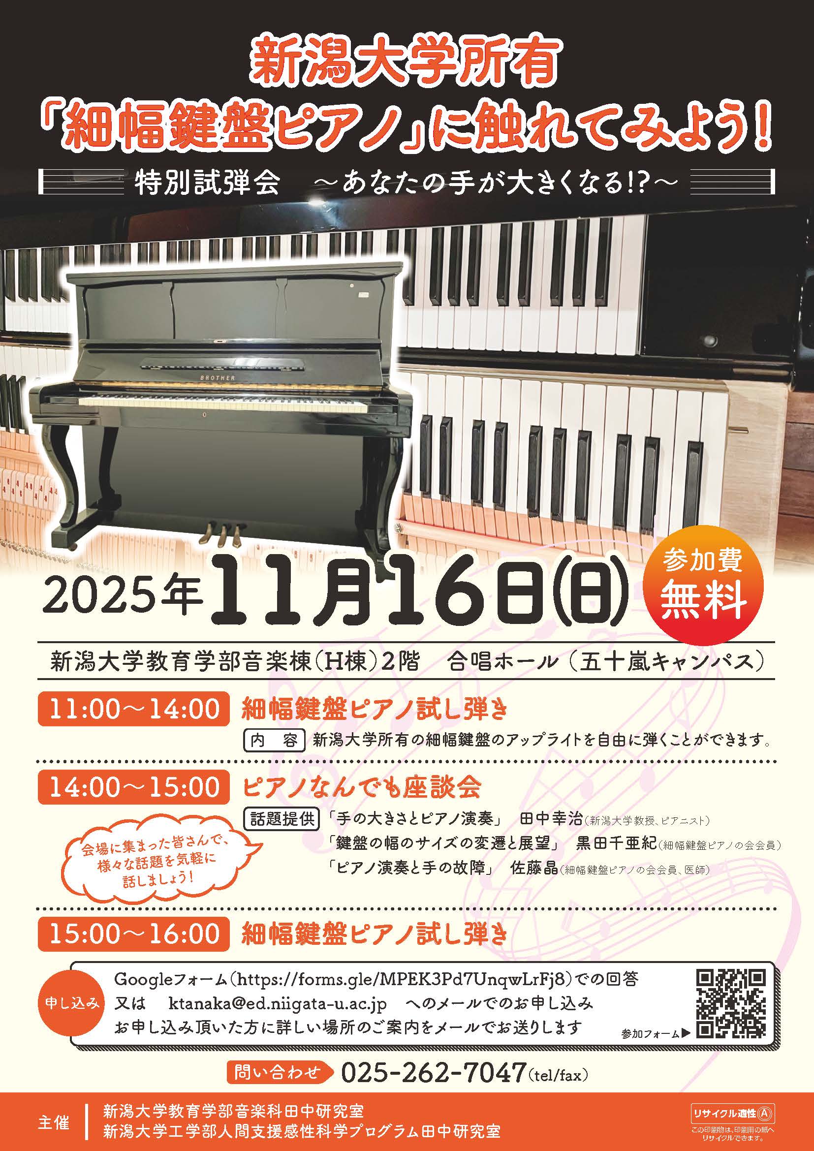 新潟大学教育学部音楽棟で「細幅鍵盤ピアノ試し弾き」が開催されます。