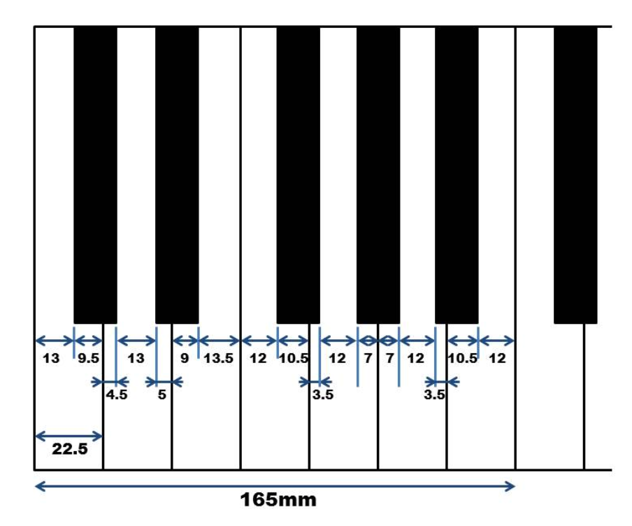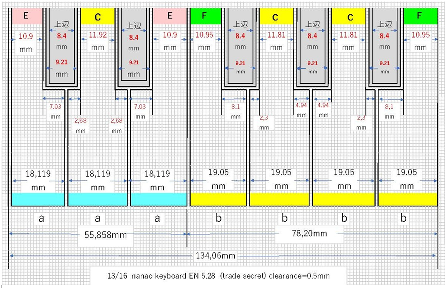 In the current standard keyboard, all the white keys are uniform in width. On the other hand, the width of the upper part of the white keys (so and la) is narrower than the width of the upper part of the white key (re). The figure shows a keyboard diagram of a Bechstein (standard keyboard, 165 mm per octave). The upper part of the white key “Re” is 13 mm. The upper part of white keys “so” and “la” is 12mm. *The problem is that the fingers of the “big hands” are not able to enter or exit the upper part of the “so” and “la”.