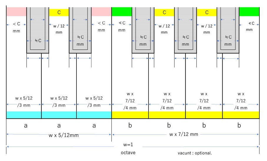 If w (width) is the octave, the width of each key is defined as follows (This is Nanao Hayasaka’s original design as a general-purpose keyboard configuration.) In other words, whether the octave is 165 mm on the standard keyboard or 153 mm on the DS 6.0 keyboard, it will be available as same as 140mm on the DS 5.5 keyboard. (w=140) Mr. Steinbuehler called it “Wonderful!”.